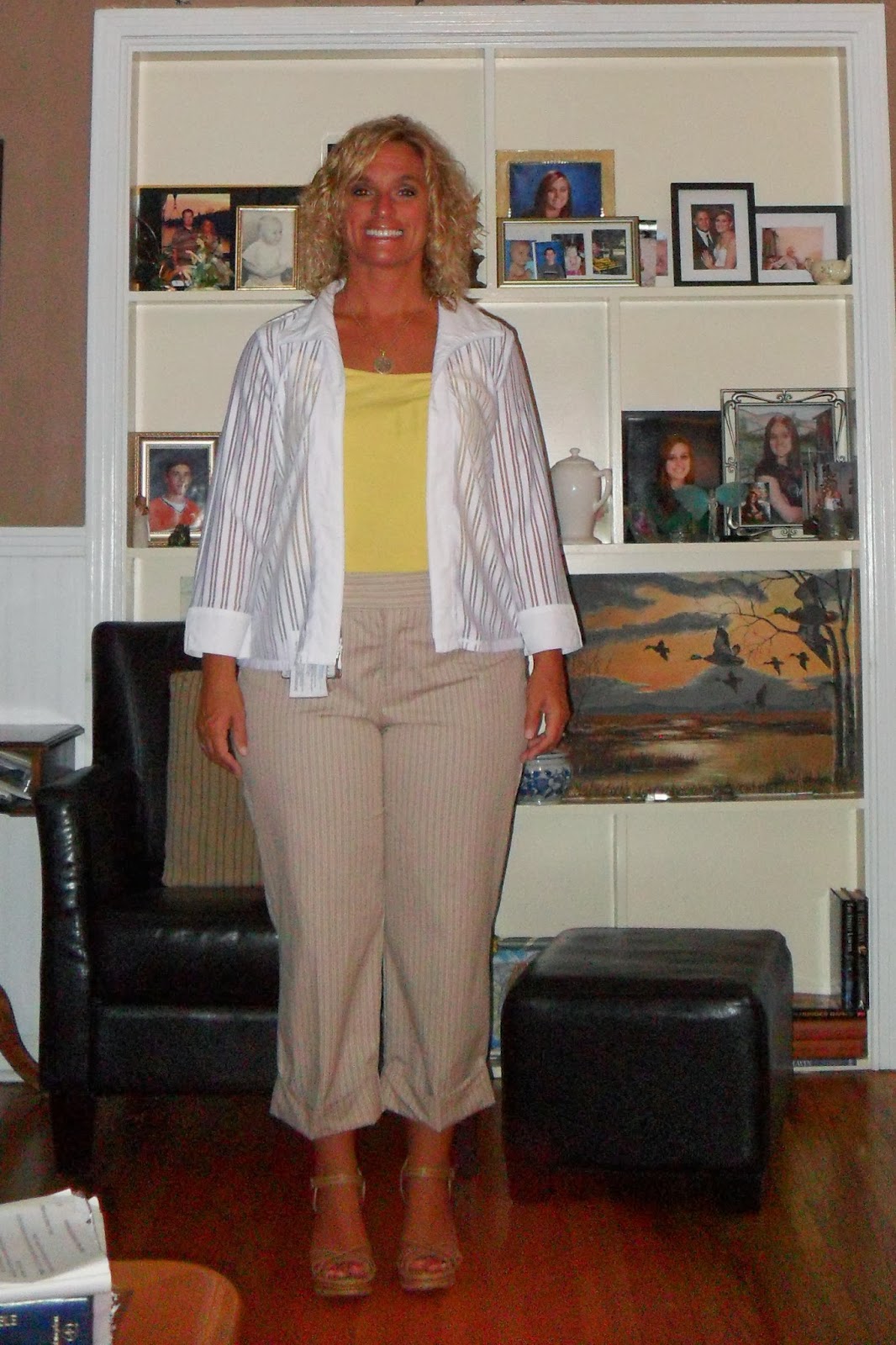 I am very sad to say that this yellow tank got tangled up with the sheets in the wash and did something funky with one of the strings - so this may be the last appearance. This is part of the week before Labor Day that I was trying to wear all the white while I could. I ended up zipping the little jacket and it looked better but an just an overall "ok" on this one. I am very glad this is Friday, I am exhausted - I struggled to complete a project for my biggest account just bestowed on me. I was frustrated trying to figure out what I should do, what tools I needed, and I really didn't think I should be doing this. Once I got over it and stopped mumbling and grumbling and embraced I was going to HAVE to learn it and own it if it was going to get done. So I pieced together information from three different departments and I'm proud to say I owned it and conquered it but not without the price of complete brain drain. Hope today is an easy and quick day. How has your week been? Hope you have great weekend :)
